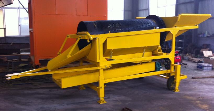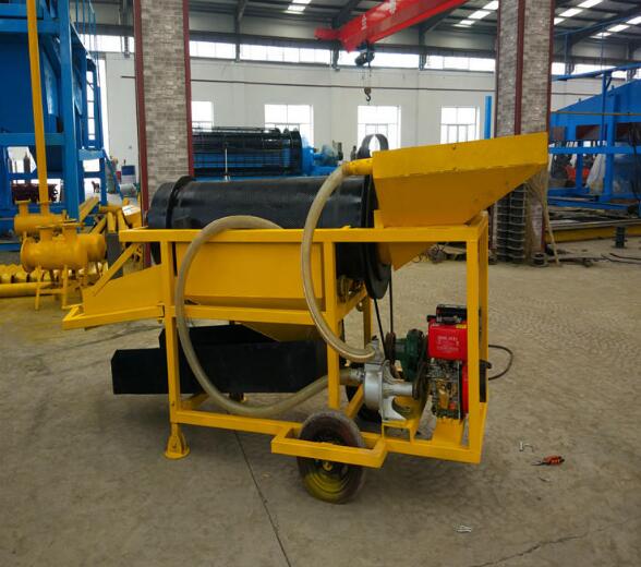小型淘金車是滾筒篩式淘金機械,由柴油機作為動力源,為篩分設備和水泵系統提供動力,屬于集成化淘金設備。采用輪式底架,可由牽引車輛拖拽,便于在復雜地形的礦區進行移動作業。