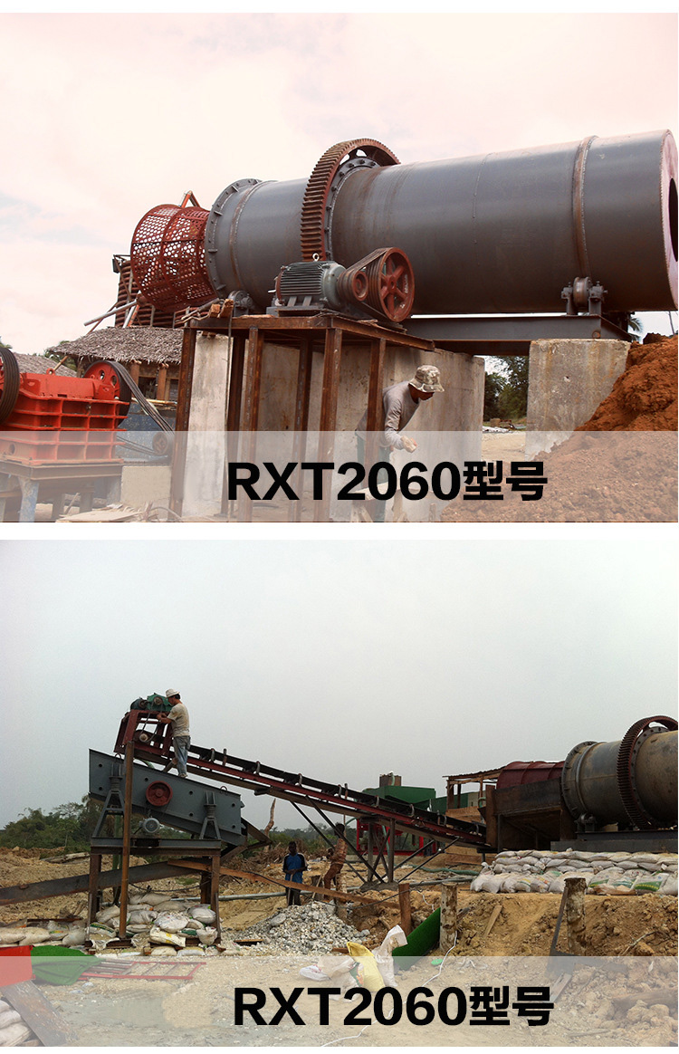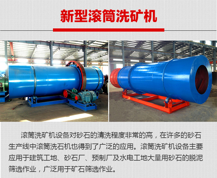 清洗筒體被四個拖輪支撐,電機帶動減速機,大小齒輪帶動清洗筒體低速旋轉。含有泥團和石粉的礦石自進料口給入,進入旋轉的滾筒內,被清洗滾筒內安裝有一定角度的**橡膠襯板不斷帶起拋落,自進料端到出料端移動過程中多次循環,并被順向或逆向的沖洗水沖涮洗滌,清洗干凈的礦石經提升器提升卸入雙層錐形篩,分成粗、中、細三個粒級分別排出。含有污泥的廢水則通過出料或給料端的帶孔擋板流出。