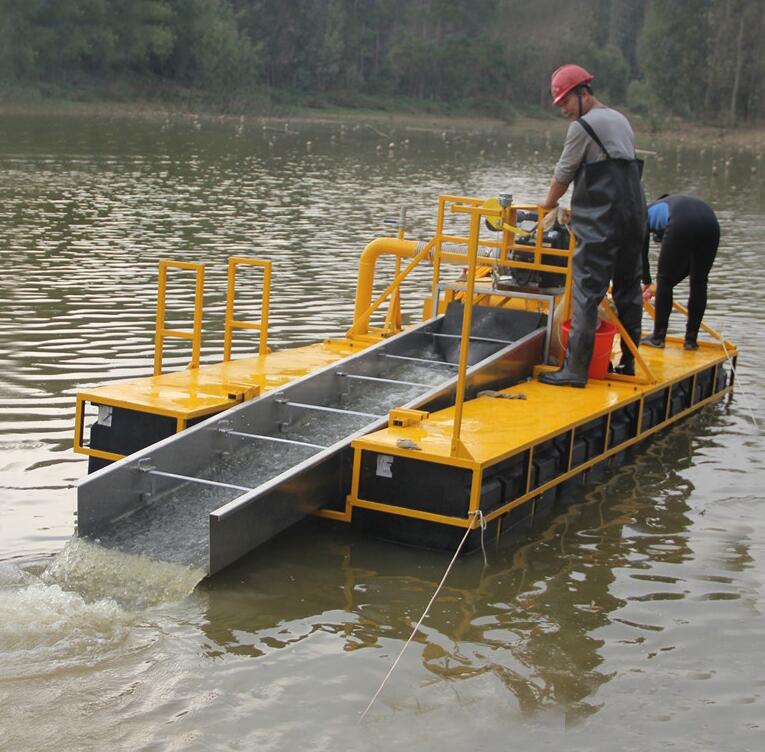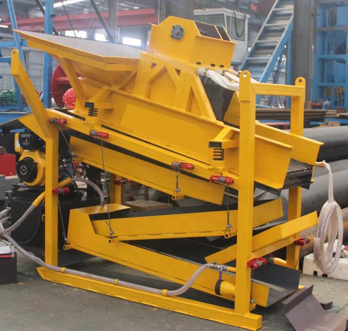 第二種小型的沙金機器 小型的沙金溜槽,這種小型的沙金溜槽上方有料斗和隔壁篩,可以將石塊隔離出去。把石頭隔離出去,含沙的礦料進入下方的沙金溜槽進行黃金的回收。這種沙金溜槽回收率比較高。自動化程度比較高,是現(xiàn)在比較普遍使用的小型沙金機器。 這幾種小型的沙金機器可以根據(jù)礦區(qū)和礦料的不同來選擇,很多客戶選擇小型的設(shè)備是主要用于探礦或者是小型小范圍的開采, 有了收益后再上大型的開采設(shè)備。現(xiàn)在這幾種設(shè)備在非洲、南美洲等多個地區(qū)應(yīng)用比較廣泛。砂金回收設(shè)備
