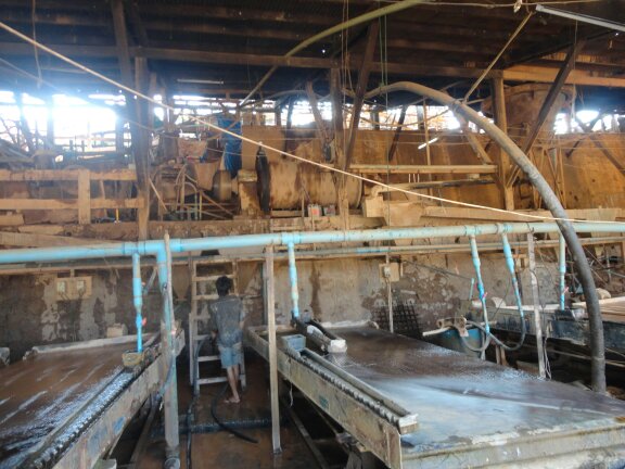 巖金礦經過破碎后就需要重選設備將黃金回收住,新型的巖金礦重選設備有:魯晟水套離心機、選礦機、跳汰機、搖床和溜槽等幾大類。溜槽類包括:蠕動溜槽、鼓動溜槽、皮帶溜槽、毛毯溜槽、振動溜槽等多種。每種溜槽所回收的金顆粒度和金的形態都是不同的。 另外往復式選礦機、跳汰機、搖床等幾種重選設備可以根據金的形態和顆粒度與溜槽等其他重選設備搭配進行金的回收。這樣才能是回收率達到高。因為每種重選機所針對的顆粒度和金的形態不同。可以采用聯合重選,使其達到好的效益。