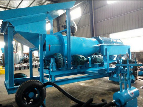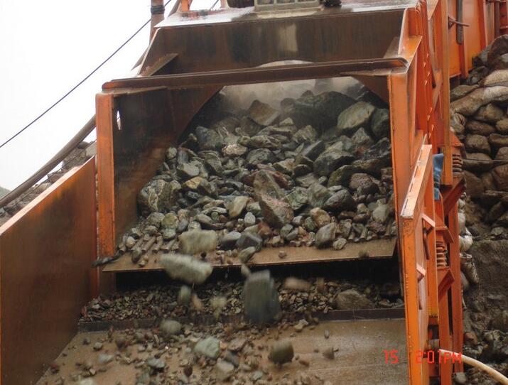 料斗不僅有全自動洗礦的功能,礦料進入篩分系統還特別的迅速,不需要給料機,料斗內部還有攪拌系統,對礦料進行攪拌,尤其是含泥量高的沙金礦,效果非常好。然后礦料均勻的進入篩分系統。篩分系統是有動力的,有滾筒篩和振動篩兩種,滾筒篩里面帶有鉸刀,分離的時候回進行攪拌,可以將泥巴打碎。振動篩適用于含石頭多的沙金礦,這種振動篩篩分迅速,效果好。