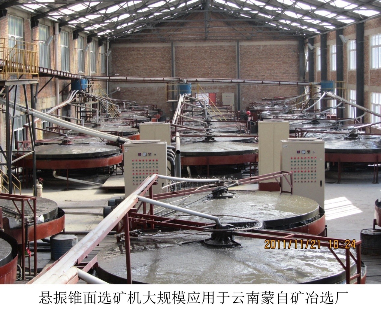 懸振錐面選礦機(jī)”是依據(jù)拜格諾剪切松散理論和流膜選礦原理研制而成的新型微細(xì)粒重選設(shè)備。當(dāng)攪拌均勻的礦漿從分選錐面的給礦器進(jìn)入盤(pán)面初選區(qū)時(shí),礦漿流即成扇形鋪展開(kāi)向周邊流動(dòng),在其流動(dòng)過(guò)程中流膜由厚逐漸變薄,流速也隨之逐漸降低。